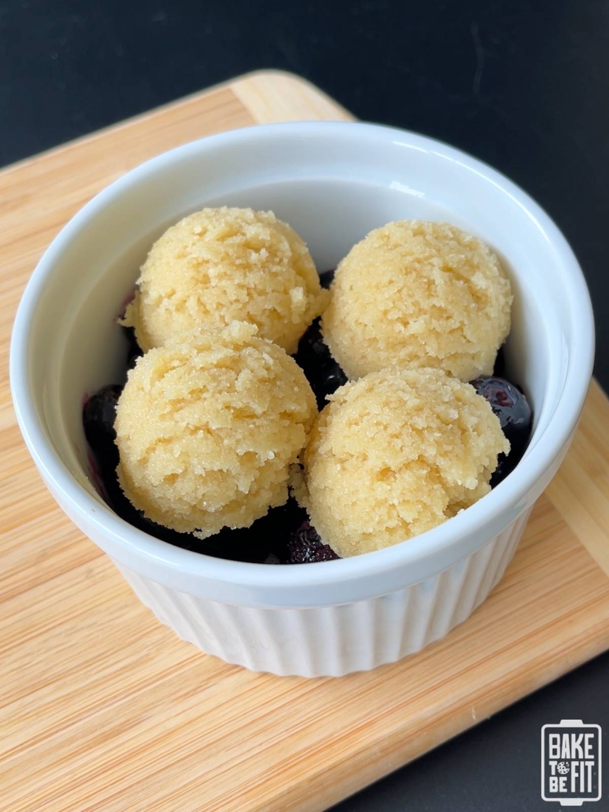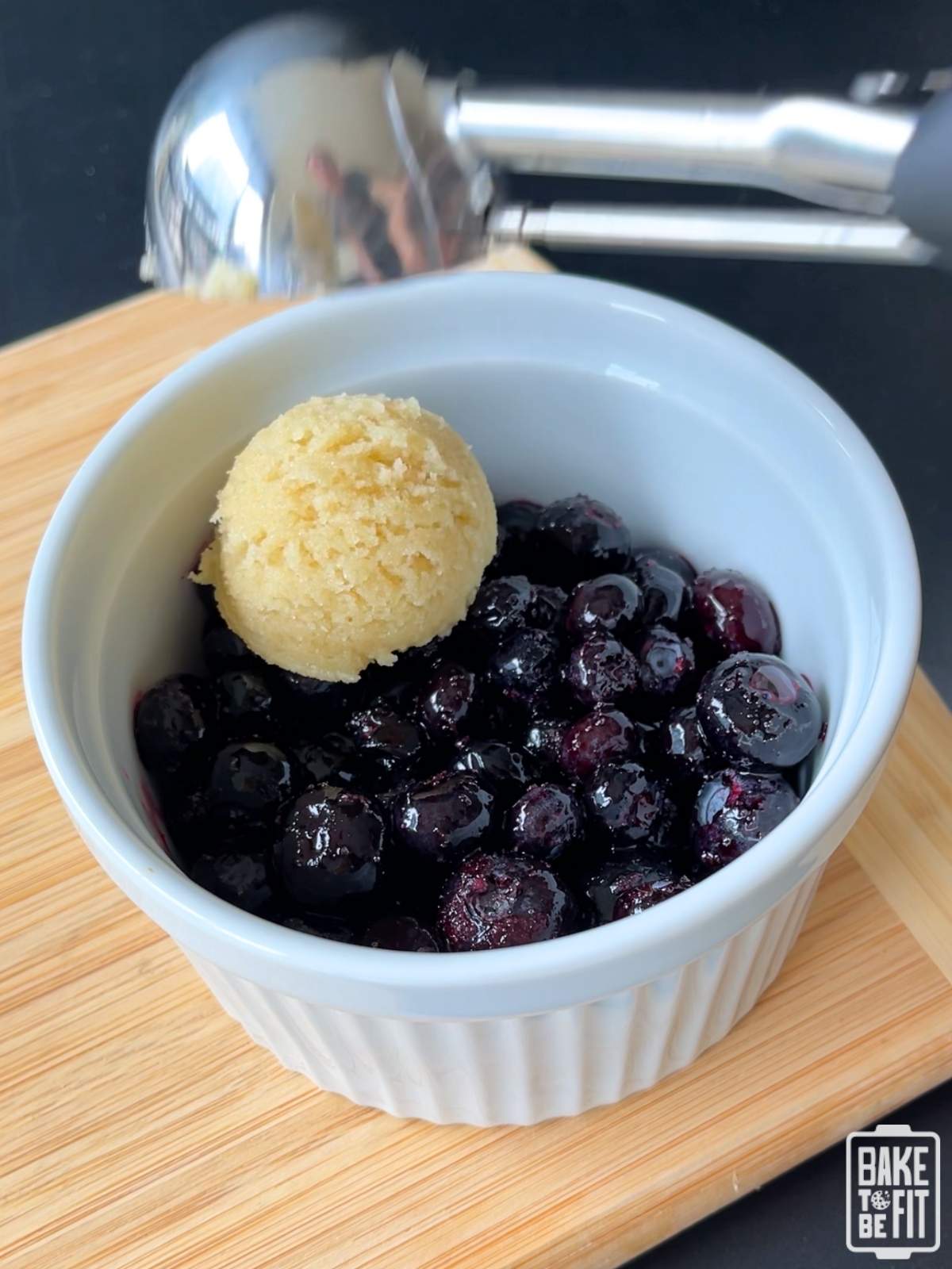 - Prepare the berry base: In a bowl, mix blueberries, 1 tbsp sweetener, and lemon juice. Transfer to a 4.5×4.5 inch ramekin or baking dish.