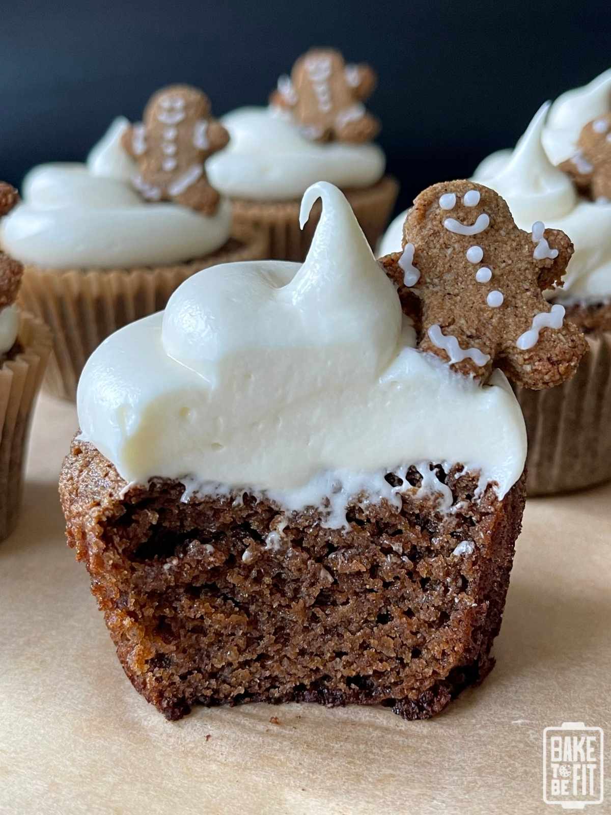 Pipe or spread the frosting onto cooled cupcakes and top with a mini gingerbread man if desired. For the gingerbread men, I used a mini gingerbread man cookie cutter and the crust/topping recipe from my Low Carb Gingerbread Cheesecake Bars.