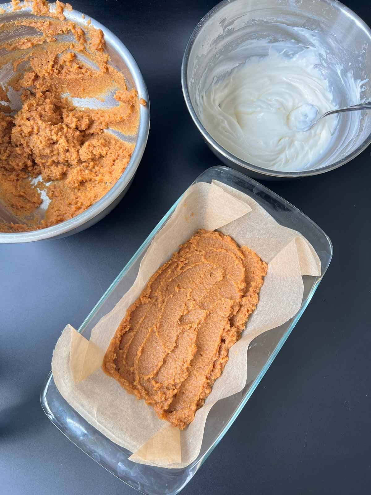 - Layer: Spread half the batter in a parchment-lined 8×5 loaf pan, add the cream cheese filling, then top with remaining batter. For a more swirled look, layer in more sections, alternating 1/3 batter, 1/2 cream cheese, 1/3 batter, 1/2 cream cheese, remaining 1/3 batter. To add extra swirl, swirl a knife through the entire loaf before baking.