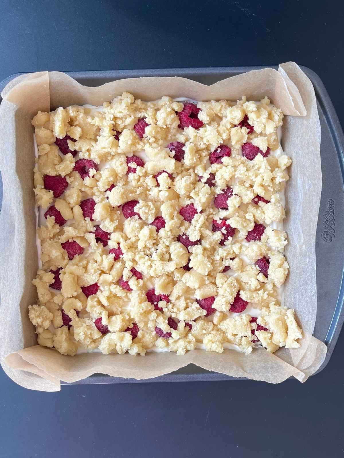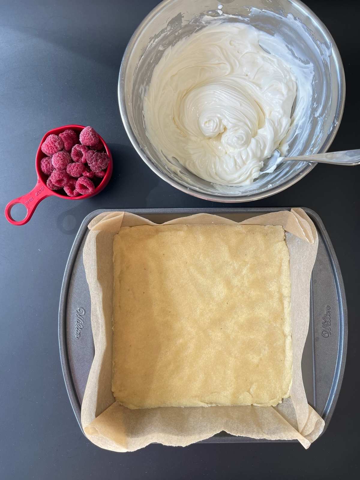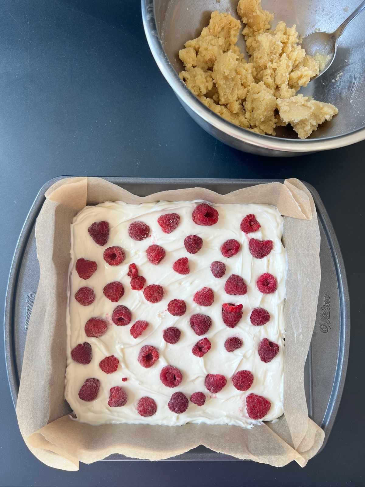 - Assemble: Press half of the crust mixture into the pan. Spread the cheesecake filling evenly on top. Sprinkle raspberries over the filling, then crumble the remaining dough evenly across the top.