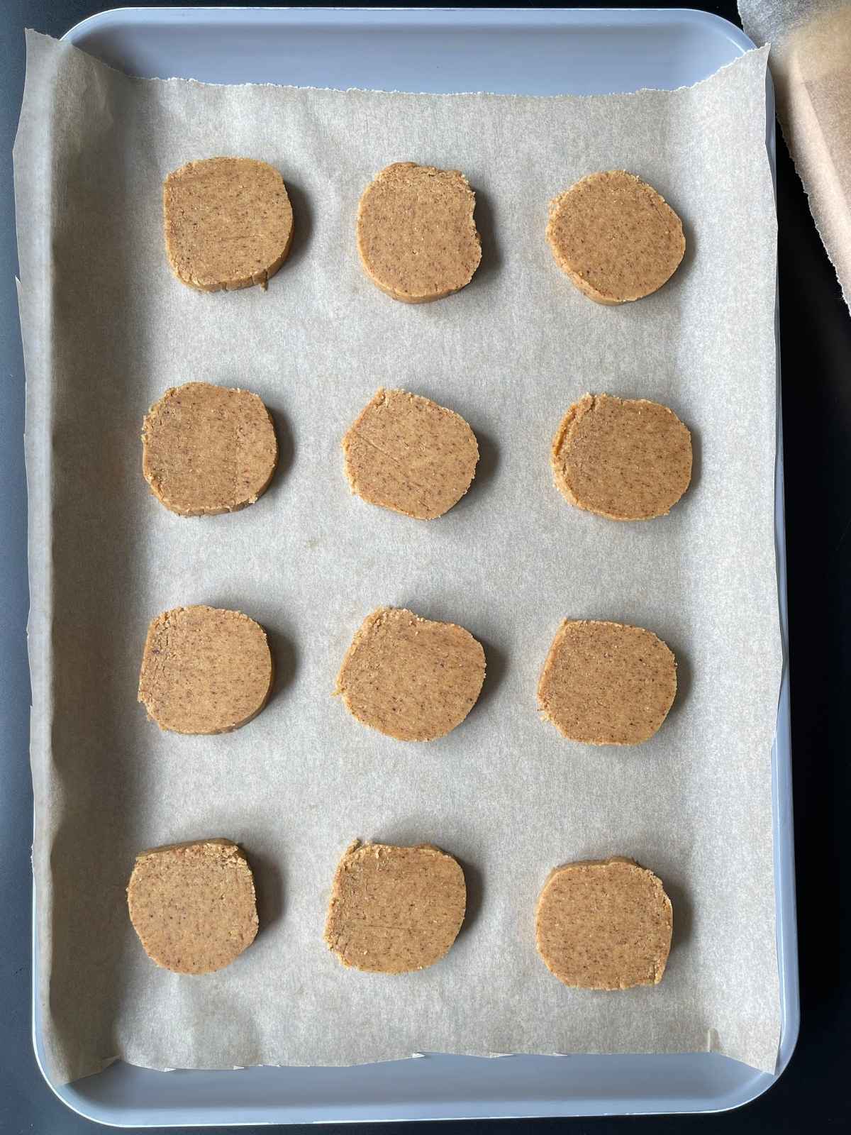 Preheat the oven to 350ยฐF and line a baking sheet with parchment paper. Slice the chilled dough into 16 equal cookies, about 3/8 inch thick each. Arrange on the baking sheet and bake for 9โ11 minutes. Let cool completely.