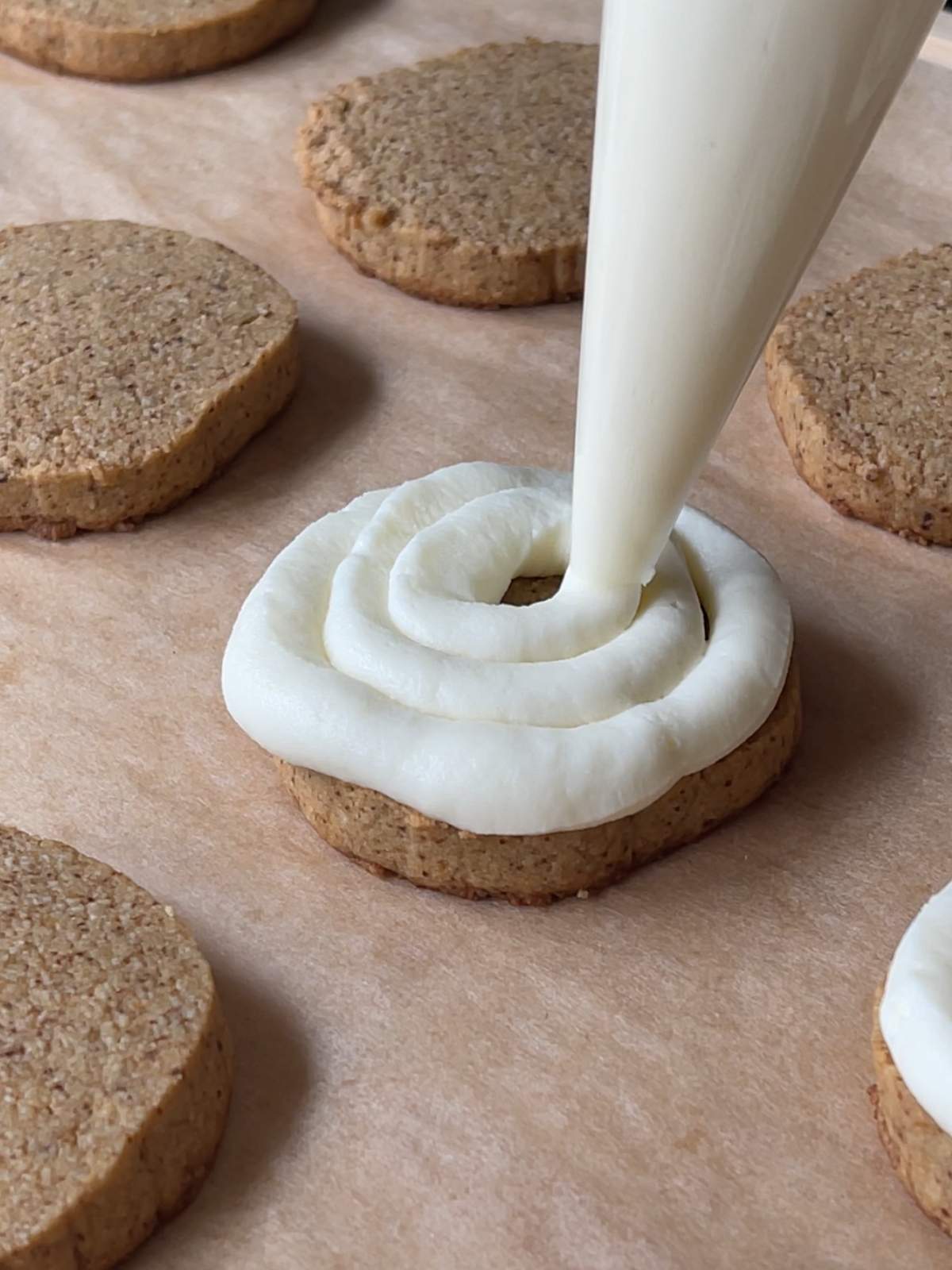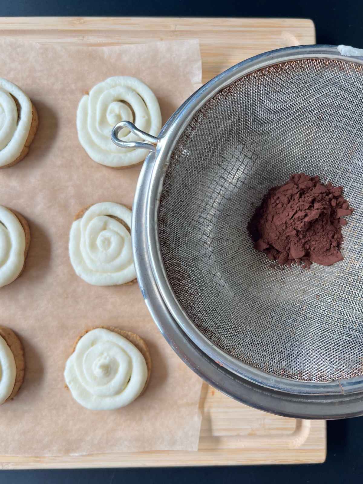 - Assemble: Pipe or spread frosting onto cooled cookies. Dust lightly with cocoa powder just before serving.
