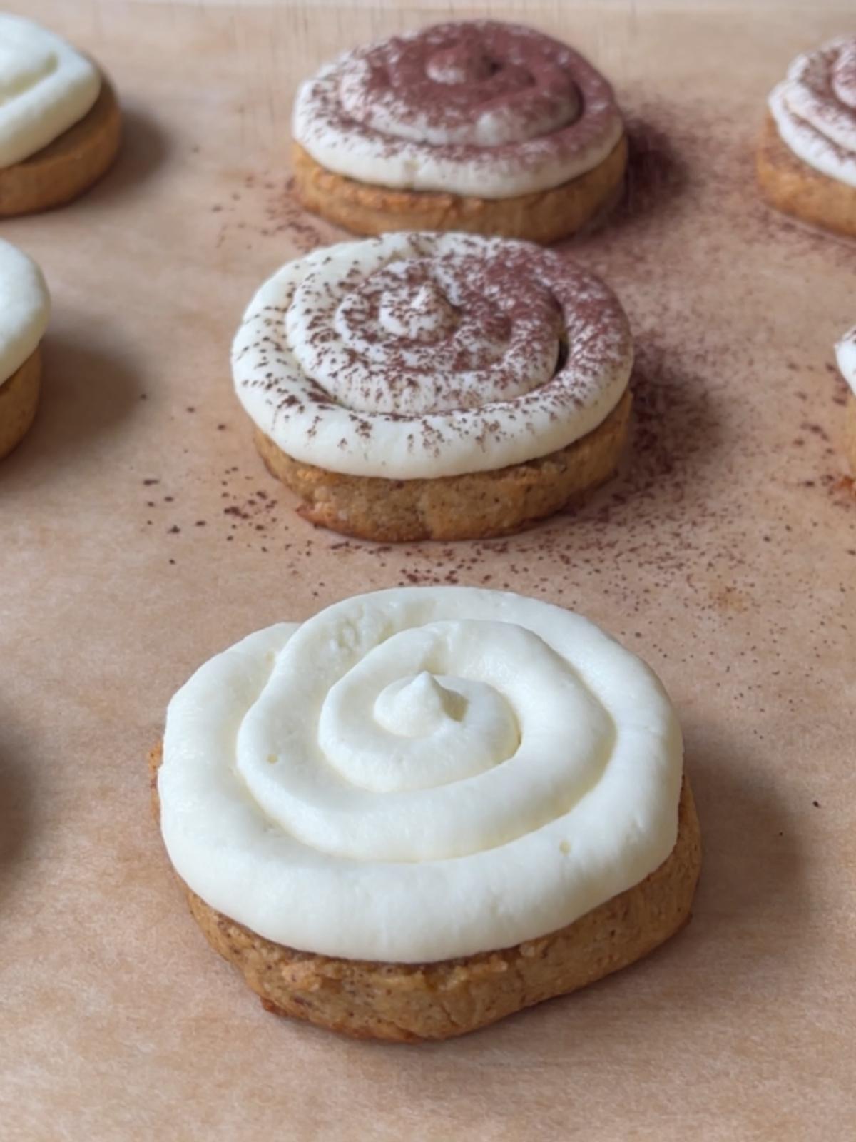 Espresso shortbread cookies topped with a creamy mascarpone frosting and finished with a dusting of cocoa powder. These keto tiramisu cookies truly taste just like classic tiramisu, but they’re super low in carbs with only 2 net carbs per cookie. Rich without being heavy, perfectly balanced, gluten-free and sugar-free. If you love tiramisu but donโt want to deal with all the layers and steps, this easy cookie version is for you.